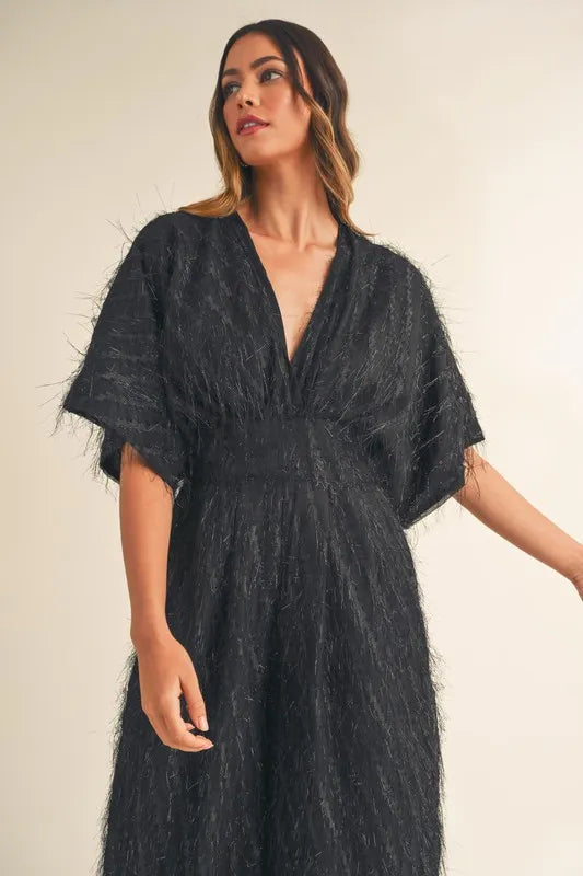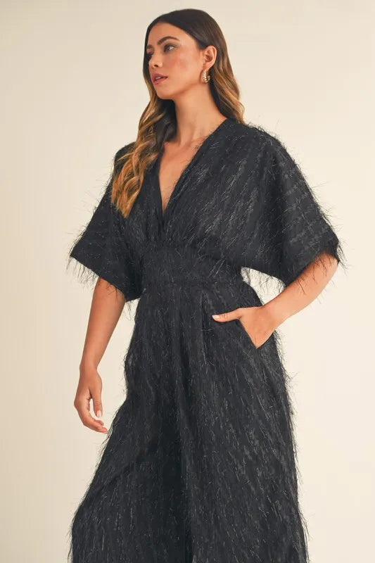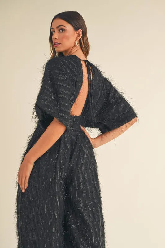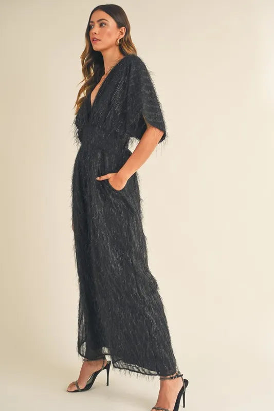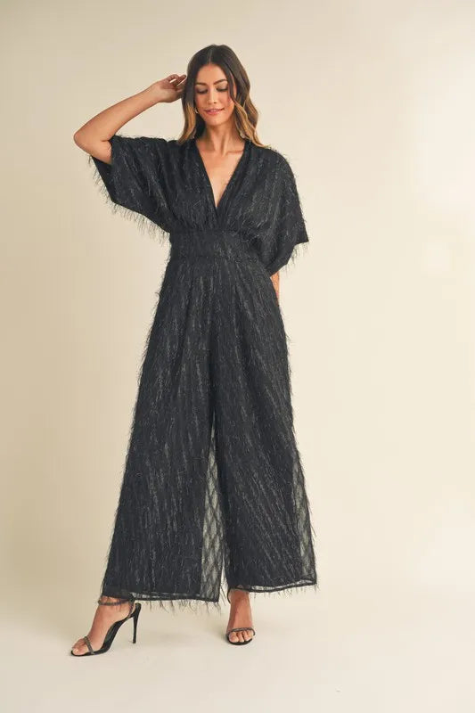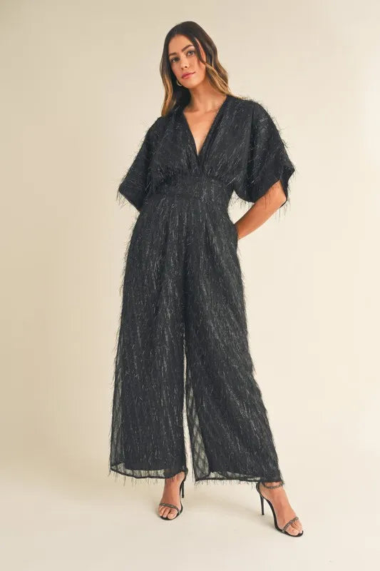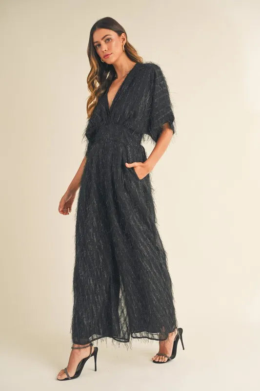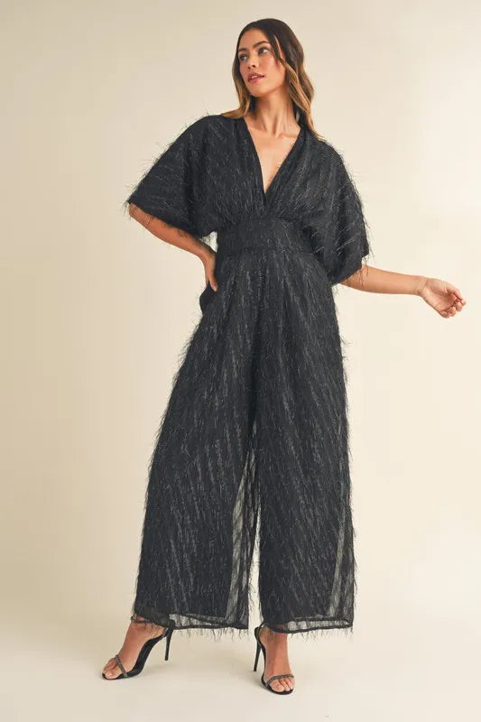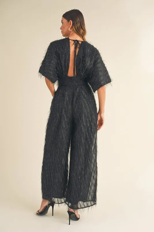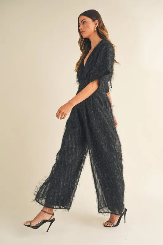 MABLE Fluffy Deep V Neck Wide Leg Jumpsuit
